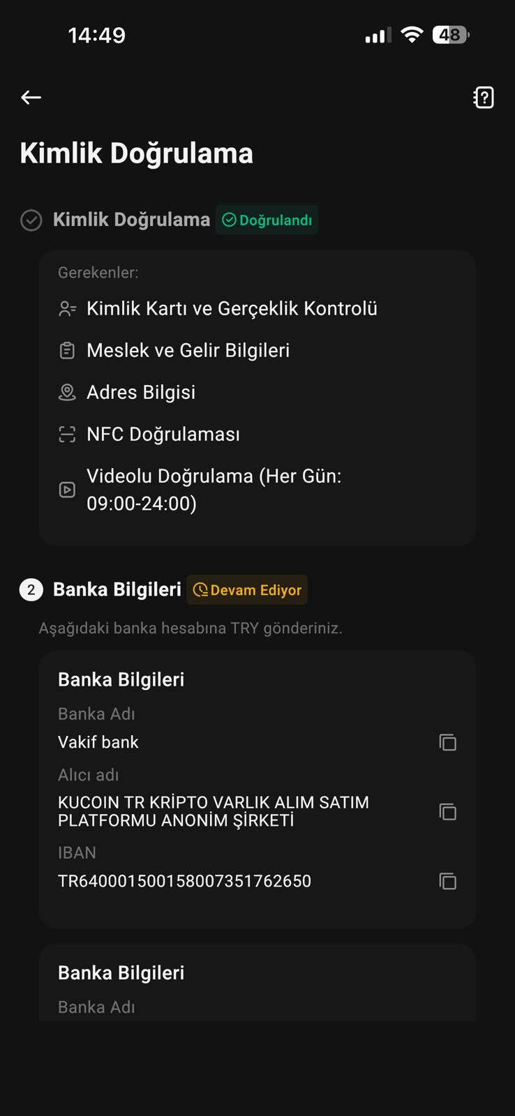 Tüm yeni kullanıcıların, KuCoin TR'nin ürün ve hizmetlerine erişim sağlamak için kimlik doğrulama işlemini tamamlaması ve itibari para yatırması gerekmektedir. Kimlik doğrulama süreci, kişisel bilgilerin sağlanmasını, kimlik fotoğraflarının çekilmesini, meslek ve gelir detaylarının bilinmesini, adres doğrulamasını ve video doğrulamasını içermektedir. Bu prosedür, kara para aklama ve terör finansmanı gibi yasa dışı faaliyetleri önlemeye yönelik taahhüdümüzün bir parçasıdır.